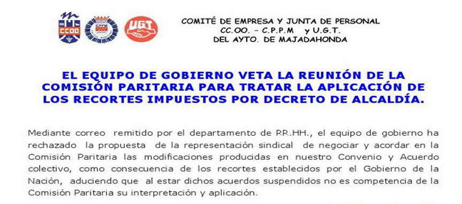 Una de las actuaciones que decidimos llevar a cabo desde el inicio de esta nueva legislatura (de Ayuntamiento y sindical), fue mantener permanentemente informados a todos los grupos municipales de todo lo relativo a Recursos Humanos en el Ayuntamiento, todo tipo de actuaciones que realicemos nosotros y de las que realice el equipo de gobierno. Una vez informados los grupos municipales del último y gravísimo acto del concejal de personal de denegar la celebración de la asamblea, el grupo municipal socialista en el Ayuntamiento de Majadahonda ha dado eco de la noticia a través de una nota de prensa propia, y que os adjuntamos aquí. Por otro lado, estuvimos esperando a que el Concejal nos llamase para aceptar nuestro ofrecimiento de reunirnos el Jueves a las 10 de la noche, para que no perjudicase a los vecinos al perder su jornada laboral con nosotros, pero no nos llamó, tal vez es que estaba doblando turno de trabajo y salía a las 11 de la noche, que hay que dar ejemplo. |