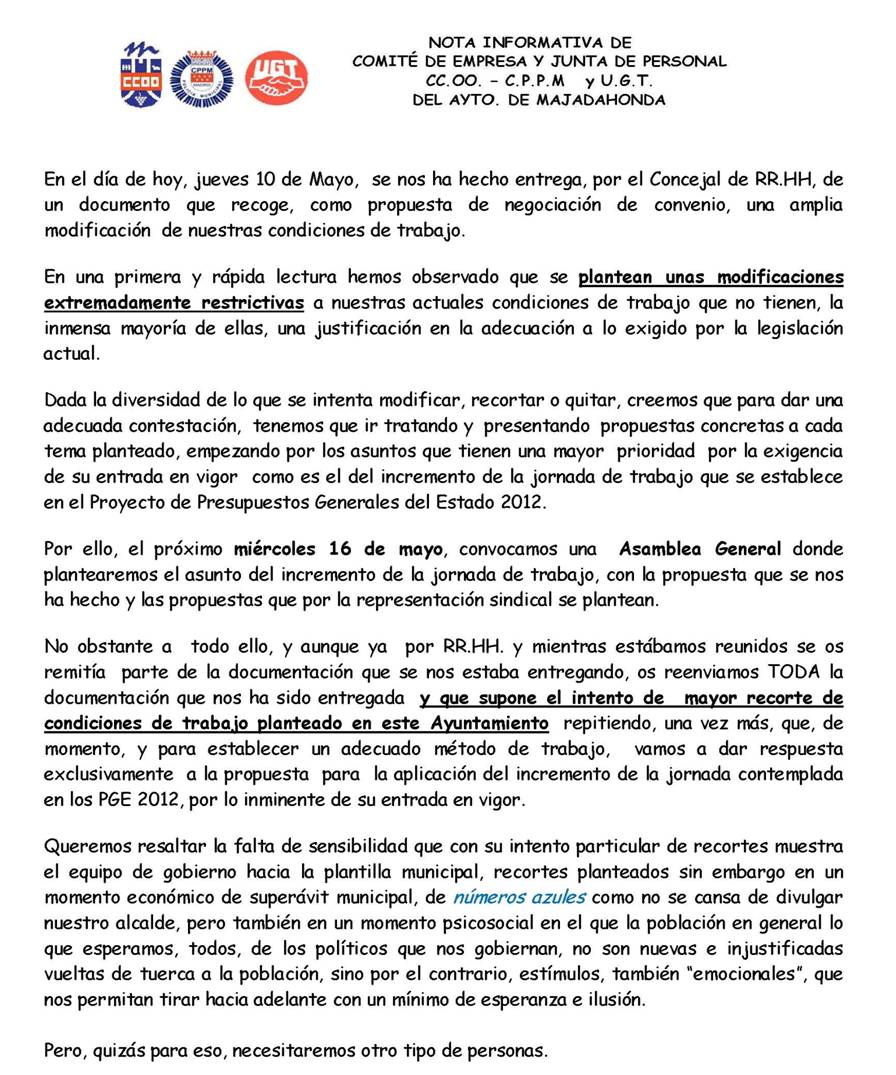 | 11/05/2012 | Nota informativa y convocatoria de asamblea para el miércoles 16 de mayo. |
