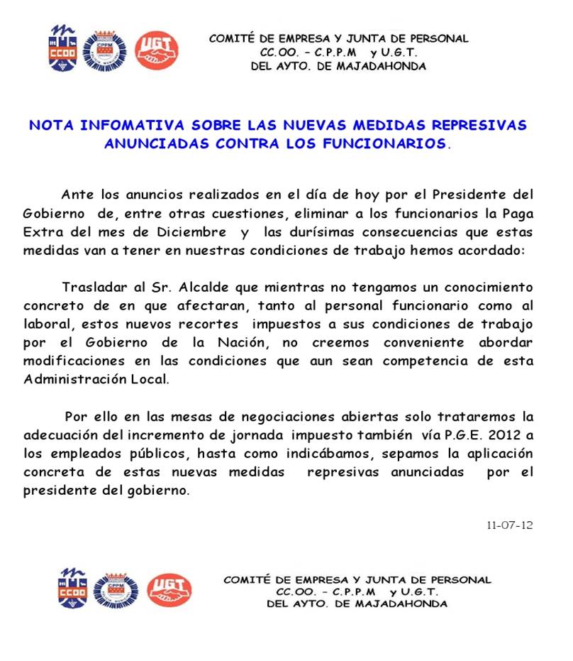 Os adjuntamos la nota que hemos hecho pública via intranet y que también hemos registrado en el Ayuntamiento dirigida al Alcalde y al Concejal de RRHH, ya que después de lo aprobado hoy en el Congreso de los Diputados, creemos que es lo que debemos hacer. Después del recortazo de hoy, paga extraordinaria de Diciembre y más días de trabajo, además de la reducción de la prestación por I.L.T, proponemos que la mesa de negociación se centre unica y exclusivamente en la aplicación del incremento de jornada. ¿O que hacemos, nos sentamos a negociar si nos quitan también la productividad y la tercera paga? |