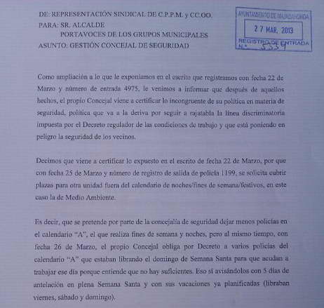 | 19/03/2013 | Escrito sobre Concejalía de Seguridad | ||||||||||