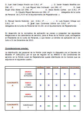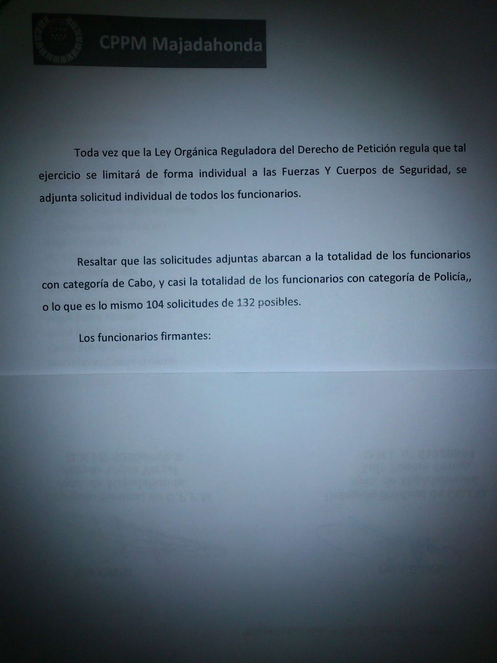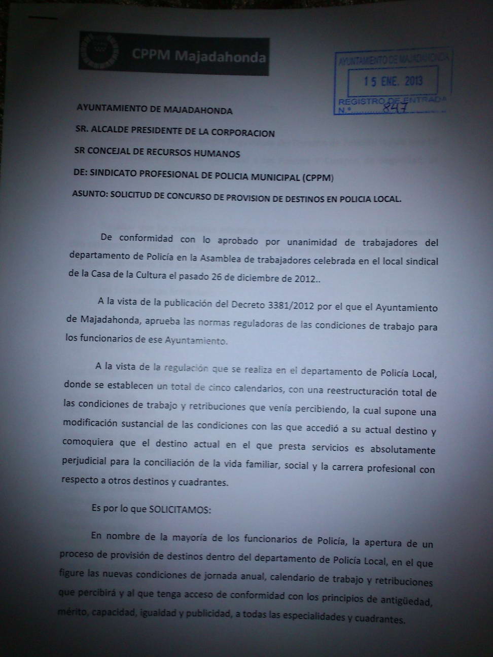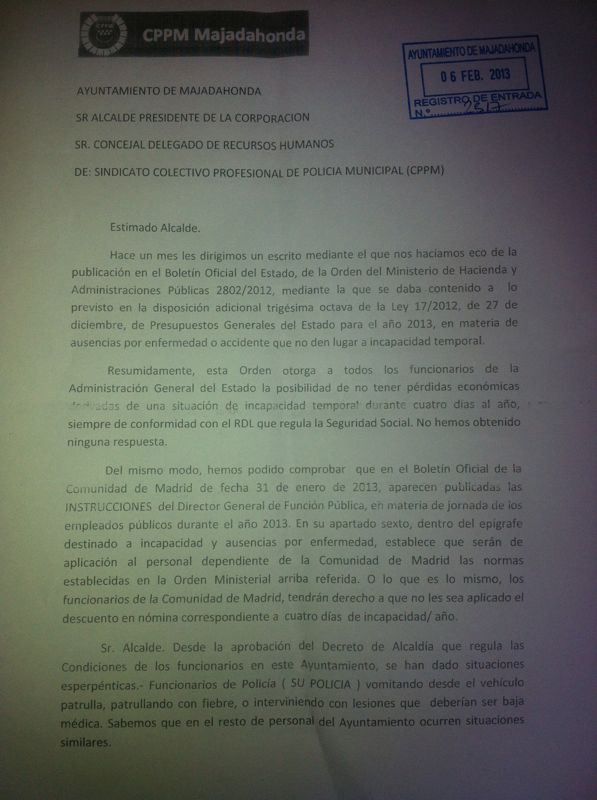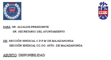 Os adjuntamos el escrito que hemos registrado hoy en el Ayuntamiento. El motivo del mismo, en el escrito nos referimos al Decreto 2542/2013, es que un compañero que no tiene ni teléfono fijo en casa ni teléfono móvil, lo puso en conocimiento del departamento de RRHH, informando que le sigan notificando en su domicilio o en el trabajo, y la contestación fue que es ilegal, que tenemos obligación de dedicarnos exclusivamente a trabajar, algo inherente a nuestra condición de funcionarios, y de estar localizados permanentemente por nuestros medios, para si al jefe le viene bien llamarnos para prestar servicio en cualquier momento, algo inherente a nuestra condición de policías. Las dudas que tenemos es si hay dos tipos de policías y de disponibilidades: unos, gratis y pagándose su medio de localización, y otros, cobrando dos pluses de disponibilidad y con un móvil pagado por el Ayuntamiento (en este último caso, la disponibilidad solo abarcaría de lunes a viernes, mañana o tarde, excepto festivos, que eso se paga con horas extra aparte). |