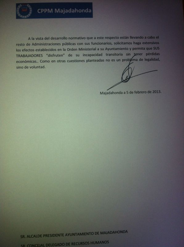 Os adjuntamos el escrito que hemos registrado hoy en el Ayuntamiento, solicitando que se nos aplique al igual que a los funcionarios del Estado y recientemente a los de la Comunidad de Madrid, esa mejora en las prestaciones por IT. |