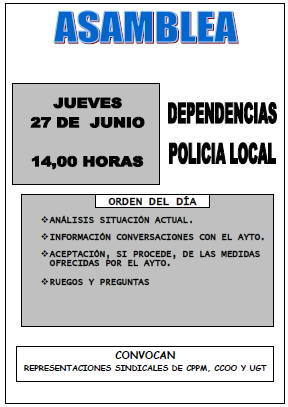 Como ya os adelantamos ayer, si bien hasta hace una semana las conversaciones directas y personales con el Alcalde y el Concejal de seguridad, iban por buen camino y prácticamente quedaron a falta de algún fleco para cerrar un acuerdo beneficioso para ambas partes, y que aparte de mejorar las condiciones de trabajo de la plantilla y del servicio al ciudadano, y de crear el clima laboral propicio para iniciar las negociaciones el 3 de Septiembre, en cuanto han entrado en acción en las dos últimas reuniones el Oficial, el Suboficial 115 y el cabo 107, todo ha quedado destruido. De los puntos acordados prácticamente con el Alcalde, la contestación de estos 3 funcionarios fue: - A parte, se querían reservar las 25 horas de disponibilidad (sin compensación si las haces en festivas ó nocturnas) para poder seguir fastidiando a quien ellos quieran con decretos de 4 horas. - A parte, el Director de RRHH (la pata del banco que faltaba), no quería garantizarnos que el 10% de distribución irregular de jornada no nos lo iban a aplicar, que eso ya lo veríamos más adelante. Esto podría suponer que hasta 160 horas anuales, te podrían cambiar libranzas por días de trabajo a su antojo (imaginaros al "Señor de los Decretillos" disponiendo de 160 horas para hacerte ir cuando quiera). Entonces, después de esta sumisión del Alcalde y del Concejal a las presiones del oficial, el suboficial y el cabo 107, nosotros no tenemos nada más que hablar. Nos vamos y punto. Por nuestra parte, lo hemos intentado, hemos aportado ir 21 días más que el año pasado, todos en viernes y solape de la noche en fin de semana, y asumir horas de sábado de mercadillo con la bolsa, es decir, aportábamos terminar con las horas extra casi al 100%. Pero estos 3 funcionarios, en lugar de buscar una solución para que los demás aporten un granito de arena para cerrar el acuerdo, lo que han hecho ha sido destruirlo y decir que vengamos más los mismos. Así que hasta ahí no podemos llegar, nos plantamos y a partir de ahora sabéis quienes son los responsables de nuestra situación laboral (y personal a los que nos afecte) y lo que pase a partir de ahora, lo bien o mal que funcione la policía, será de los que han impuesto el sistema actual.Y nosotros volveremos al punto en que dejamos nuestras reivindicaciones cuando el Alcalde nos llamó por primera vez. De una manera ahora en los meses de verano y de otra forma a partir de Septiembre. |