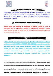Además de las movilizaciones que estamos haciendo y seguiremos, como las últimas del auditorio, la pegada de carteles y reparto de panfletos o la del jueves pasado con nuestra pancarta y el muñeco "Pepito" por la Gran Via, vamos a ir yendo un poco mas allá. Ya dijimos cuando publicaron el Decretazo del Alcalde, que a partir de ahí cada uno asumiese las consecuencias y su responsabilidad. Hemos registrado hoy martes el escrito que os adjuntamos y que mandaremos también a la Comunidad de Madrid, del que esperamos que tenga continuidad y se esclarezca hasta el final. ¡¡¡¡NO A LA DISCRIMINACION¡¡¡¡¡ ¡¡¡¡NO A LA IMPOSICION¡¡¡¡ ¡¡¡¡NEGOCIACION YA¡¡¡ |