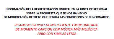 Os adjuntamos la nota que hemos mandado a través de intranet para informar a todo el personal del Ayuntamiento sobre el estado de la actual Mesa de Negociación de funcionarios: Una música más melódica pero con similar letra podría servirnos para definir la nueva canción que estamos escuchando en la Mesa de Negociación para mejorar, creemos que ese era el objetivo común, el Decreto que regula, desde este año 2013, las condiciones de trabajo de los funcionarios municipales . Os adjuntamos una tabla comparativa de lo que planteamos, y que ya conocéis por correo anterior, y lo que se nos está ofreciendo en la Mesa de Negociación. Como observareis en el documento que os adjuntamos, antes de ofreceros esa comparativa hemos incluido un breve resumen del expolio que en nuestras condiciones de trabajo se lleva perpetrando desde el año 2010 a los empleados municipales en este Ayuntamiento, para intentar con ello dejar sin valor esos planteamientos de "borrón y cuenta nueva" y "que me das a cambio de darte menos de lo que te he quitado antes" que al parecer guía la actuación del Equipo de Gobierno hacia sus empleados municipales. Esperamos que en la próxima nota Informativa podamos seguir diciendo que la nueva contra-propuesta recibida se hace con una música igual de melódica pero que una Letra más armoniosa que la actual. REPRESENTACIÓN SINDICAL JUNTA DE PERSONAL CC.OO. ‐ C.P.P.M. ‐ U.G.T |