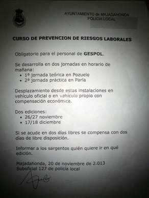 Desde el año pasado, la jefatura decidió de forma unilateral y pasando de lo establecido en el anexo de policía, que no compensaba ni las 50 horas en asuntos propios ni el transporte por los cursos que realizamos fuera de la jornada laboral. En Octubre registramos un escrito sobre el asunto dirigido al Concejal, del que no recibimos respuesta, y en Noviembre registramos otros escrito dirigido a la comisión paritaria para que se reuniese y tratar el asunto, del que tampoco recibimos respuesta. La única respuesta que hemos recibido al respecto, ha sido a través de la comisión de formación, donde nos han dicho que como esos cursos se pagan con el dinero de caja fija de cada departamento, que la jefatura de policía ha estimado que ya si eso se lo gastan ellos en lo suyo y en quien ellos quieran. Pues nada, una vez mas, solo nos dejan la vía del contencioso administrativo; la semana que viene llevaremos la documentación a los abogados para que se nos reconozca que ese derecho nos correspondía según el anterior anexo. Estaríamos hablando de reclamar las horas de cursos realizados fuera de la jornada laboral, hasta un máximo de 50 horas al año, y el transporte correspondiente, que se os hayan denegado. Mientras llevamos la documentación a los abogados, los que estáis en este caso, que solicitasteis e hicisteis un curso externo relacionado con el puesto de trabajo (Academia, sindicato, etc), entregarnos la solicitud, la denegación y una fotocopia del diploma del curso a cualquiera de los miembros del sindicato. |