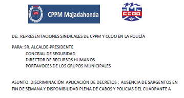Os adjuntamos el escrito que hemos registrado hoy jueves, en el que nuevamente venimos a denunciar y hacer pública una nueva discriminación en la gestión de personal en policía. El fondo del escrito que queremos denunciar es importante por cuanto si el gran problema que parece ser rompió el posible acuerdo de antes del verano, que era que la jefatura de policía establecía como imprescindible la presencia de 17 policías hasta las 4 de la mañana los viernes y sábados, ahora parece que ha cambiado. Presentaremos además este escrito en la próxima reunión de la mesa de negociación si insisten en la importancia del horario de viernes y sábados hasta las 4 de la mañana. Por otro lado, la reunión de la mesa general convocada para este viernes la han suspendido y nos han convocado al martes a la mesa de funcionarios, algo que por otro lado propusimos el otro día. |
