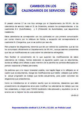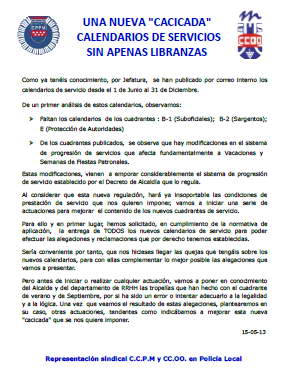 Hoy Jueves por la tarde hemos asistido la representación de CPPM Y CCOO a la Comisión informativa de Régimen Interior celebrada en el Ayuntamiento, con la asistencia de concejales del Equipo de Gobierno y de los demás grupos de la oposición. Tras lo tratado en la misma, hemos mandado el siguiente correo por intranet a todo el personal municipal y dirigido al Concejal: Asunto: DISPONIBILIDAD REUNIONES Atención:. Concejal RR.HH. Como ya le indicamos en la Comisión de Regimén Interior y ante la necesidad de conseguir, al menos, una respuesta sobre dos asuntos que consideramos no pueden tener una dilatación en su contestación - Pago de Ayudas Sociales 2013 y Calendarios servicios Navidad en Policía Local- la representación sindical permanecerá localizable y disponible en el edificio de la Casa Consistorial. Hemos dado este paso ante el parón que, por parte del departamento de RRHH, ha sufrido el actual proceso de negociación, en el cual llevamos dos semanas sin convocar la mesa de negociación ni darnos la propuesta escrita a la que se comprometieron y sin garantizarnos el concejal cuando va a ser. Como decimos en el correo, mañana viernes estaremos toda la mañana en el Ayuntamiento, primero en una reunión con los portavoces de los grupos municipales, para explicarles la trampa que pretenden hacernos con las ayudas sociales y después, nos quedaremos en la puerta de Alcaldía hasta que nos reciban y nos den alguna garantía de que van a arreglar las penosas condiciones que tenemos la mayoría en policía. En un principio, nos quedaremos nosotros esperando todo el tiempo que haga falta a que nos reciban, pero de no atender nuestra pacífica petición, no descartamos ir pidiendo la presencia de más compañeros en días sucesivos. |