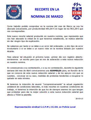 Para los que no pudisteis ir a la asamblea os hacemos un breve resumen: - Se expuso y explicó en términos generales lo que significa y el alcance del Decreto de Alcaldía. - Se informó de los escritos que por ello hemos registrado ya y que son el inicio de unos procedimientos que llevaremos hasta el final. - Como el alcance, en cuanto a las jornadas especiales y sueldos no queda claro en el Decreto, vamos a ver en esta nómina de Enero que hacen en el Ayuntamiento, por que nos tememos que a algunos colectivos les van a quitar su jornada especial. En Policía por ejemplo, tenemos pendiente de si optan por seguir estableciendo como pedimos la reducción del 6% como elemento diferenciador, u optan por eliminar la jornada especial, ó nada. Según el caso que se de, así actuaremos. Desde luego que después del escrito que registramos la semana pasada, creemos que la actuación en caso de que no hagan nada, podremos actuar en la vía penal. - Este Martes estuvimos toda la tarde en el despacho de los abogados, donde después de analizar detenidamente el Decreto, lo vamos a recurrir directamente al Juzgado, pidiendo por un lado la suspensión cautelar del mismo y su nulidad en última instancia. - Aparte de los escritos y de darles continuidad según lo que nos encontremos en la nómina, hasta entonces, en policía seguimos como hasta ahora. - En previsión de lo que nos podamos encontrar en esta nómina, convocamos asamblea para el Martes 29 a las 18 horas, día anterior al pleno de Enero. |