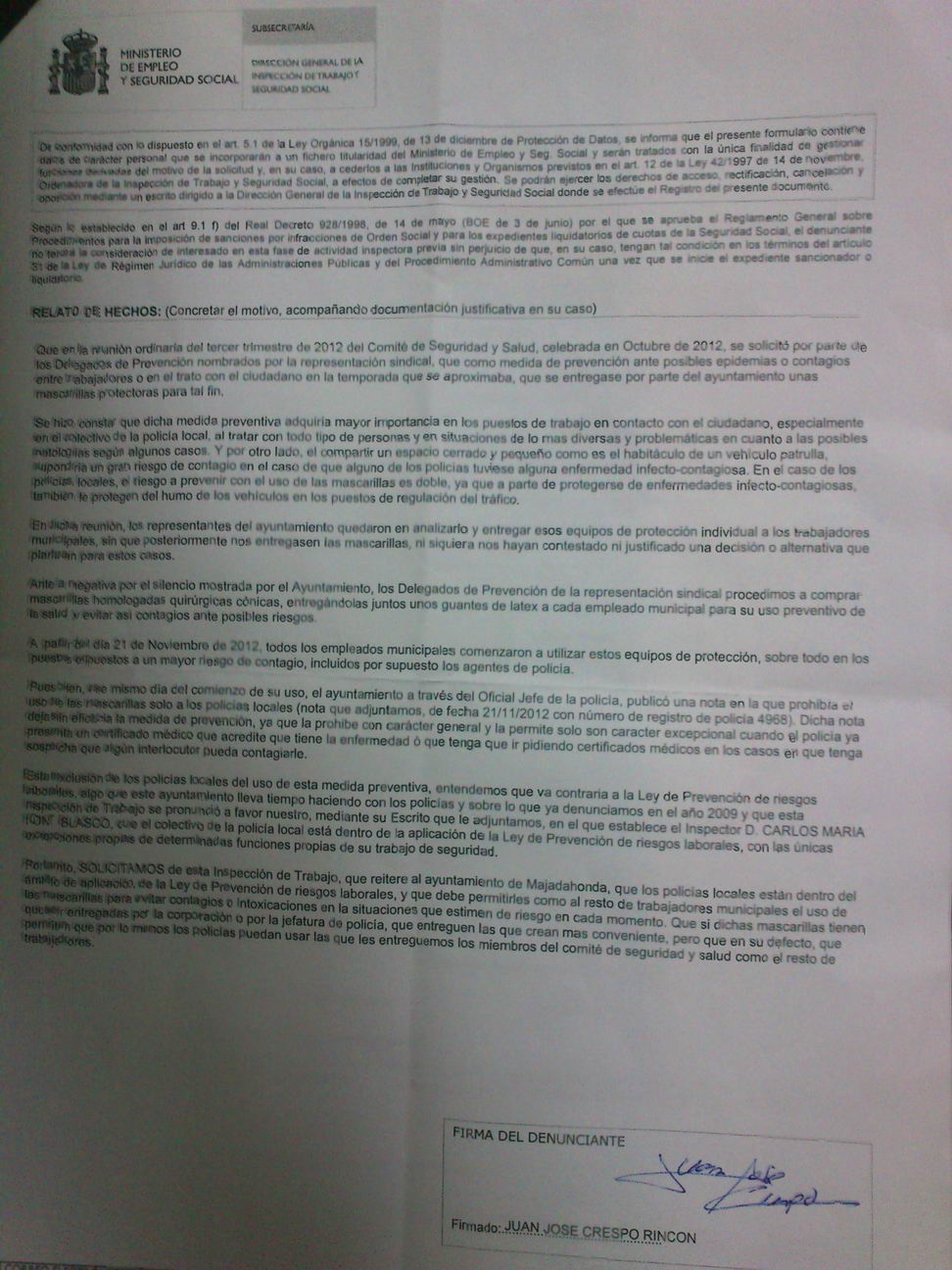 | 12/02/2015 | DENUNCIA INSPECCIÓN DE TRABAJO SOLICITANDO ADECUACIÓN ROPA DE TRABAJO EN POLICÍA | ||||||||||||||||||||||||