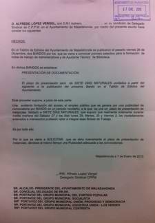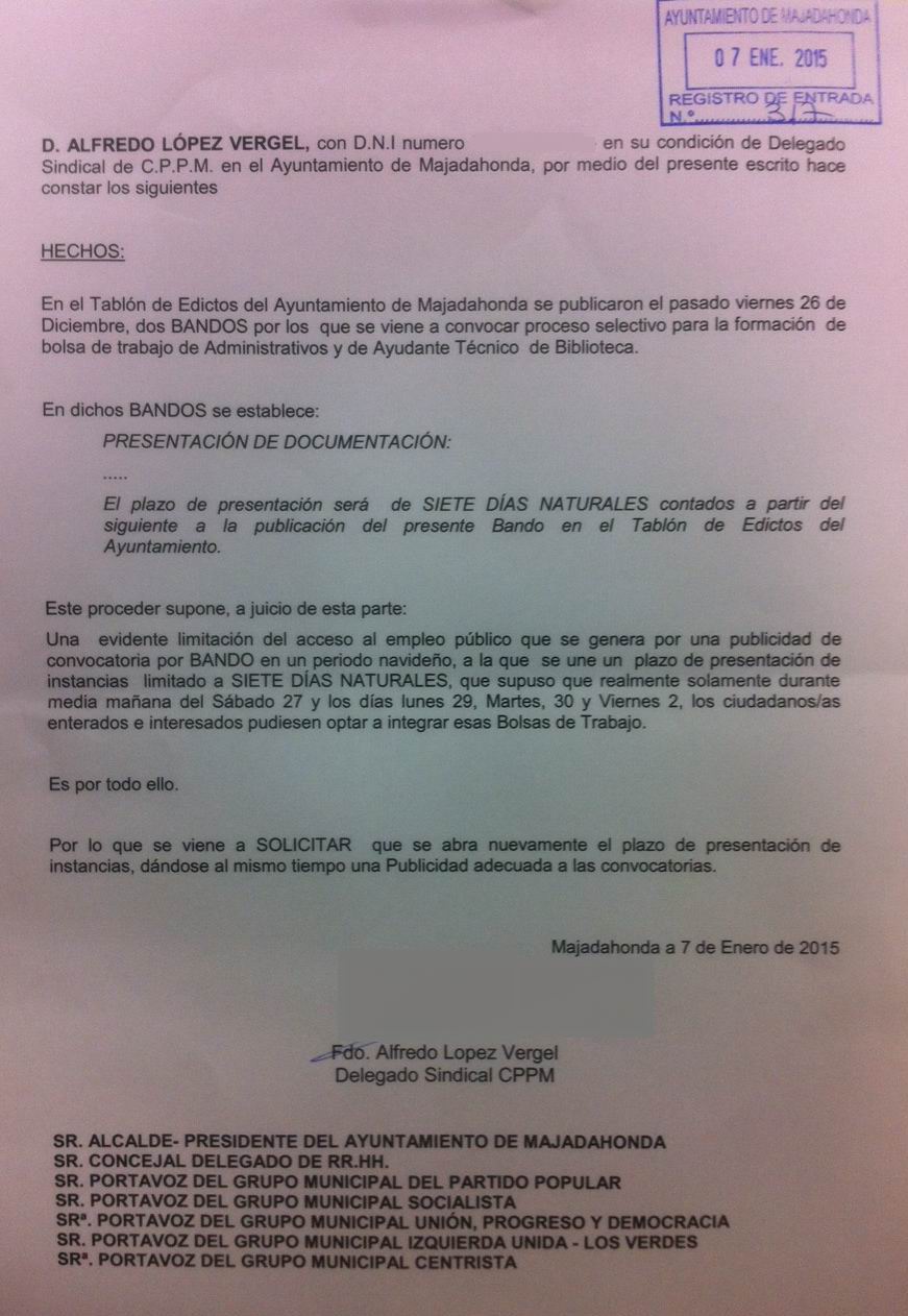 El pasado viernes 26 de Diciembre se publicaron en el Tablón de Edictos, dos BANDOS por los que se convocaba proceso selectivo para la formación de bolsa de trabajo de Administrativos y de Ayudante Técnico de Biblioteca, dándose un plazo de siete días naturales para la presentación de instancias. El acceso al empleo público sigue teniendo en la publicidad uno de sus fundamentos y signos de imparcialidad, que entendemos que se ha limitado seriamente en este caso, ya que se lleva a cabo por la convocatoria por BANDO en un periodo navideño, a la que se une un plazo de presentación de instancias limitado a SIETE DÍAS NATURALES, que supuso que en la práctica, solamente durante media mañana del Sábado 27 y los días lunes 29, Martes 30 y Viernes 2, los ciudadanos/as enterados e interesados pudiesen optar a integrar esas Bolsas de Trabajo. Es por ello por lo que nos hemos dirigido, por el escrito que os adjuntamos, al Sr. Alcalde y Grupos Municipales solicitando que nuevamente se abra el plazo de presentación de instancias y se de una adecuada publicidad a esta convocatoria de empleo municipal. |