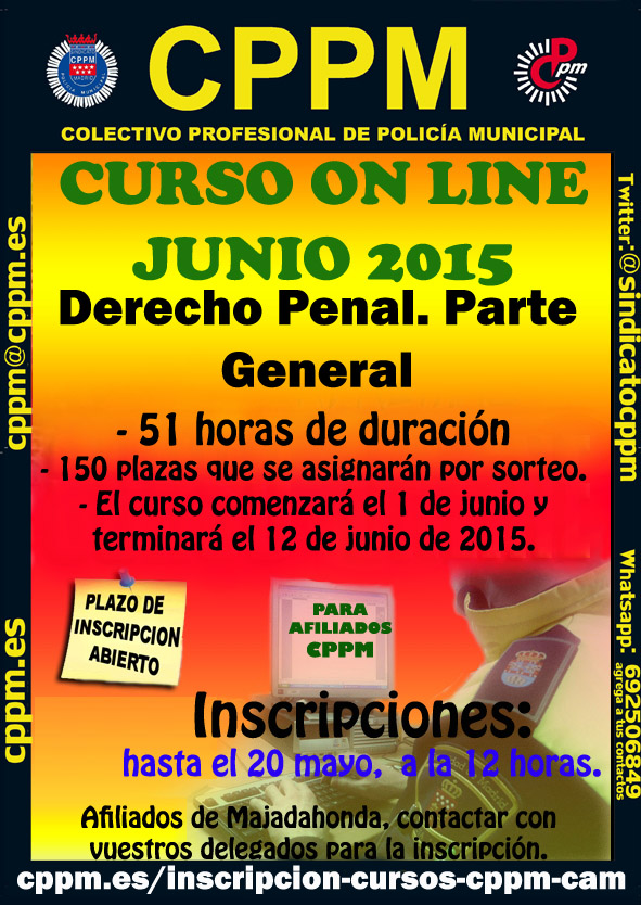 Os comunicamos que por parte de CPPM Majadahonda se ha organizado un Curso de Formación sobre la reforma del Código Penal aprobada recientemente y que entra en vigor el próximo 1 de Julio. Una vez realizada la inscripción, no debéis olvidar rellenar la solicitud de asistencia a curso para su compensación. El plazo de inscripción finaliza el día 20 de mayo. |