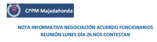 En la tarde del pasado viernes día 20/03, esta sección sindical de C.P.P.M. ha cerrado el Acuerdo de Funcionarios con el Equipo de gobierno, que permitirá la normalización de las relaciones laborales hasta el año 2019. Viendo que las reuniones de la mesa de negociación no avanzaban como debería ser para lograr el Acuerdo, es por lo que esta sección sindical de C.P.P.M, decidió no esperar y, a través del trabajo sindical, buscó nuevas vías para poder lograr lo que todos queríamos. La próxima semana, previa aprobación por asamblea de funcionarios en el Ayuntamiento, tendrá lugar la firma de dicho Acuerdo, al que invitaremos a sumarse al resto de secciones sindicales con representación en el Ayuntamiento. No ha sido un camino fácil el recorrido y por ello queremos dar las gracias a esa amplia mayoría que os habéis mantenido fieles y que lejos de apearse de un barco muy sacudido por las mareas, mantuvísteis vuestro compromiso y confianza en nosotros. Gracias a ello, hoy os podemos corresponder con este Acuerdo que, junto con las modificaciones que conseguimos en marzo de 2014, supone tanto unas nuevas mejoras para TODOS los funcionarios de este Ayuntamiento, como la consolidación de los derechos ya logrados. Desde la asamblea de policía donde presentamos y aprobásteis el acuerdo, el camino ha sido más complicado de lo esperado y ha habido que pelear otra vez lo que no estaba previsto, por injerencias que preferimos dejar al margen aquí, pero porqué no, a lo mejor algún día habrá que explicar para que, por los hechos y lo demostrado por cada uno, conozcamos las intenciones de quienes nos quieren representar. Os remitimos las Modificaciones para el Acuerdo que contiene las condiciones de trabajo para los funcionarios del Ayuntamiento de Majadahonda para el periodo 2015-2019. Como decimos, con él recuperamos y en algunos aspectos mejoramos el acuerdo 2006-2012, con la esperanza de que esta nueva senda de diálogo y reconocimiento iniciada por esta representación y el Equipo de Gobierno, aporte en el futuro frutos como el que aquí os presentamos. A todos vosotros, GRACIAS. |