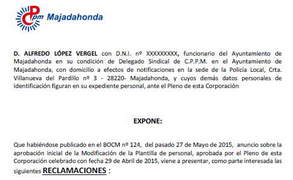 Os adjuntamos el escrito que hemos registrado hoy, por el que presentamos alegaciones a la modificación de plantilla, que les hemos pillado publicando con nocturnidad en el BOCAM. No era nuestra intención recurrir esta modificación por la que se crea nuevamente la plaza de Director de Seguridad, sinceramente no es algo que nos quite el sueño, por ello hemos apurado el plazo de presentación de alegaciones, para dar tiempo a la reunión de la mesa de negociación del lunes pasado donde nos tenía que dar el Ayuntamiento una respuesta a nuestra propuesta, una vez pedida la opinión de la Jefatura de Policía. Viendo la respuesta que nos dieron el lunes, es por lo que hemos decidido que, del mismo modo que el Oficial se ha preocupado por permitir mejorar nuestras condiciones de trabajo, nosotros nos preocupamos de facilitarle la mejora de su jubilación. No descartamos que el pleno municipal en que se apruebe definitivamente esta modificación de plantilla, nos personemos allí TODOS a pedirle al Alcalde no el privilegio de una jubilación de oro, pero sí un Acuerdo de Funcionarios. Con lo fácil que sería para todos, colaborar en las justas mejoras de todos los policías y así obtener con toda tranquilidad su ambiciosa jubilación de oro. |