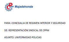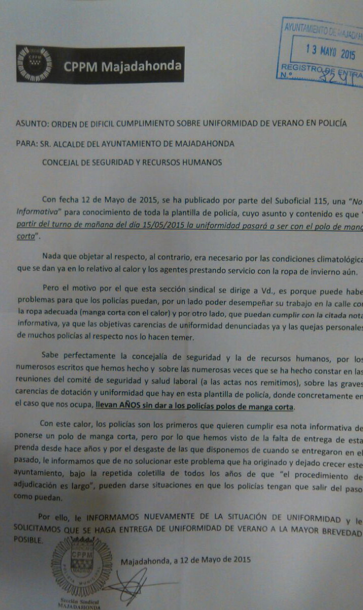 Aunque este asunto de la falta de entrega de uniformidad desde hace años, ya lo hemos denunciado vía registro en numerosas ocasiones e igualmente lo hemos hecho constar en las actas de las reuniones del Comité de Seguridad y Salud Laboral, con la publicación de la orden de llevar polo de manga corta a partir del 15 de Mayo, os adjuntamos el nuevo escrito que hemos registrado al respecto, por si se empiezan a dar casos de compañeros que no puedan cumplirlo y se las tengan que apañar como puedan. |