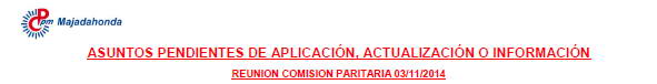 Tal como informamos al inicio de esta legislatura, la primera actuación de esta representación para la presente legislatura pasaba por la recuperación de los derechos perdidos durante la llamada "crisis majariega". En estas semanas hemos tenido varias reuniones con el Concejal de Recursos Humanos a fin de agilizar determinadas cuestiones pendientes, de forma que esta mañana a las 10:30 esta representación de CPPM ha tenido una última reunión con el Alcalde y el Concejal Delegado para darle un impulso definitivo. En ella hemos acordado: SOBRE ABONO DEL 50% DE LA PAGA EXTRA SUPRIMIDA EN 2012. SOBRE ABONO DE JORNADA ESPECIAL DEL PERSONAL DE REGISTRO. SOBRE ABONO COMPLEMENTO POR SERVICIO NOCHE LOS DÍAS 24 Y 31 DE DICIEMBRE. SOBRE INCREMENTO RETRIBUCIONES DEL 1% EN JORNADAS ESPECIALES SOBRE EXPEDIENTES DISCIPLINARIOS EN POLICIA. Posteriormente, se ha convocado al resto de representantes sindicales para ponerlo en conocimiento la decisión adoptada al respecto. Con todo ello, esta representación da por terminada la iniciativa tomada al comienzo de esta legislatura político/sindical de recuperar todos los derechos pendientes de recuperar, perdidos durante la particular "crisis majariega", que comenzó allá en 2010. En adelante seguiremos trabajando en el desarrollo del Actual Acuerdo de Funcionarios 2015-2019, bien a través de acuerdos de interpretación, bien adaptando su contenido a las mejoras que en nuestro ámbito de actuación podamos incluir, así como aquellas que pudieran provenir de la legislación de funcionarios. Como siempre, agradeceros la confianza que habéis depositado en nosotros.Estamos a vuestra disposición para cualquier duda o aclaración. |